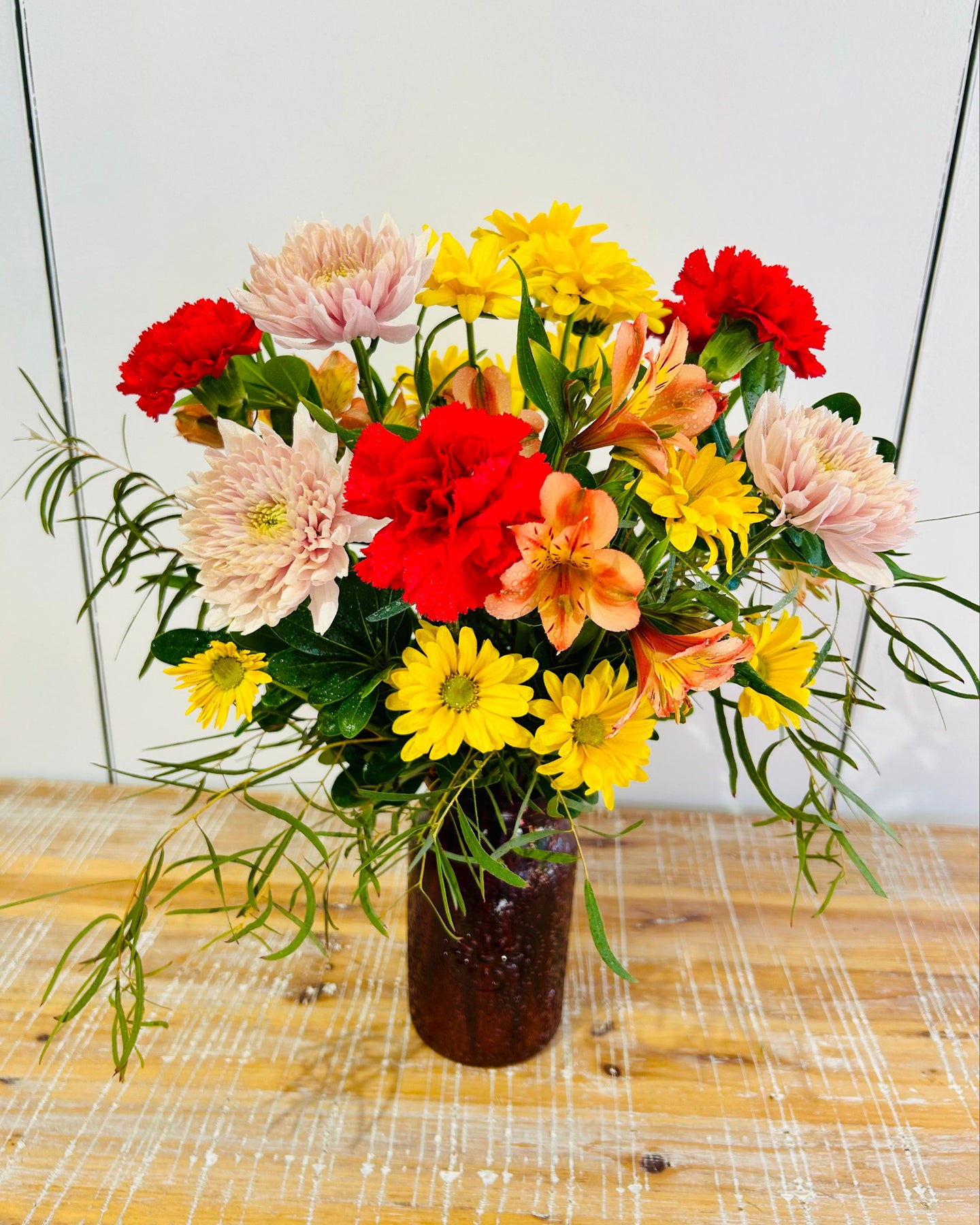 Bring the warmth of the season indoors with Fall Flavors - a charming, perfectly-sized arrangement bursting with fall color. Rich oranges, golden yellows, and deep reds come together in perfect harmony, creating. a cozy accent for any space.