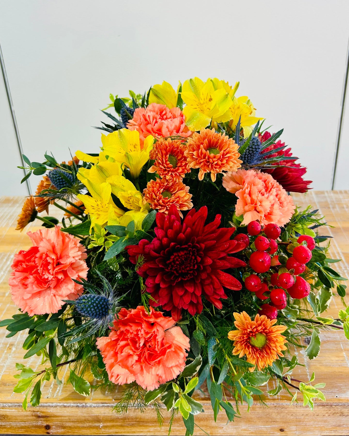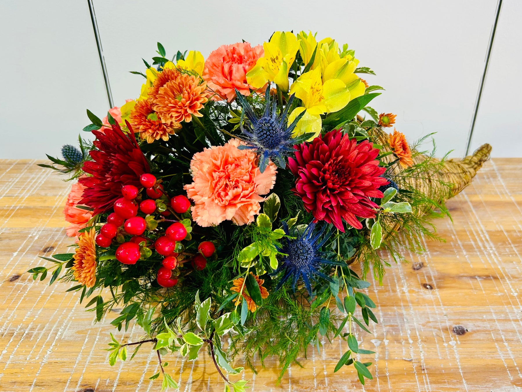 Includes: cornucopia basket, alstroemeria, cremones, carnations, hypericum, thistle, poms